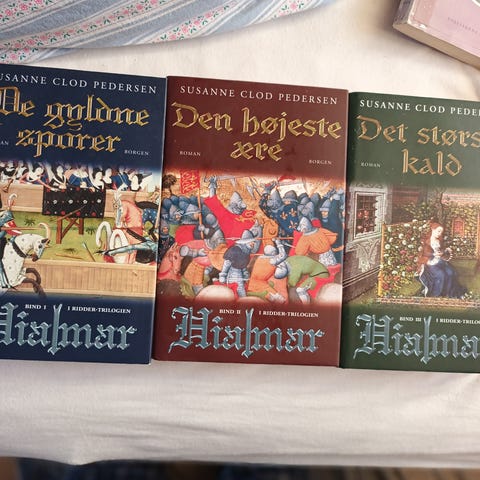 Ridder-trilogien 1-3, Susanne Clod Pedersen, genre: roman, Riddertrilogien 1-3. De gyldne sporer. Den højeste ære. Det største kald. 3 bind. Komplet. Hardbacks med smudsomslag. Førsteudgaven. Borgen 2008-2009 (g-473-1700)
