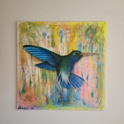 Flot farverig maleri fra 2019,måler 1×1 meter