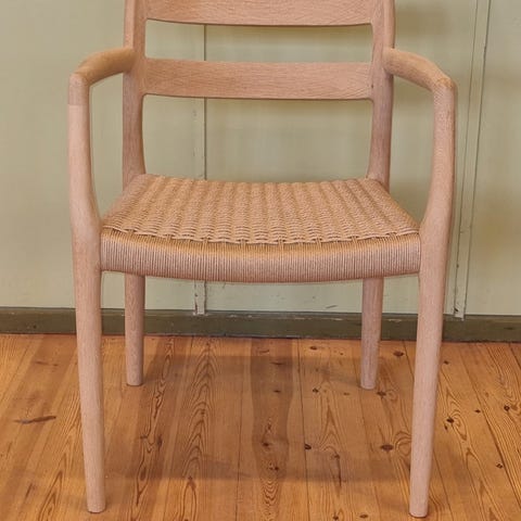 J L Møller model 85 spisebordsstol i eg og naturflet. Ingen pletter på flet.