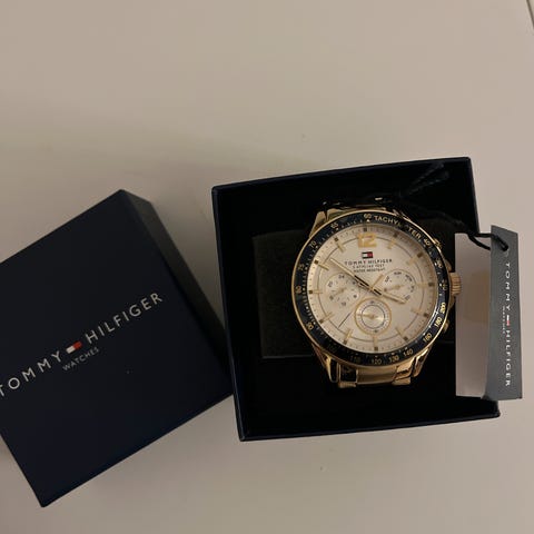Tommy Hilfiger herreur i guld med blå detaljer – som nyt, inkl. original æske