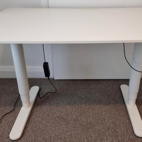 IKEA BEKANT elektrisk hæve sænkebord med hvid melaminbordplade på 120 x 80 cm og sort stel. Net under bordpladen til praktisk opbevaring af ledninger.