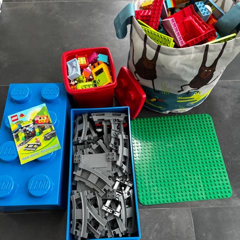 Lego Duplo, zoo, cirkus, togbane, askepots slot, brandstation, tog med tal. Hus, butik.
