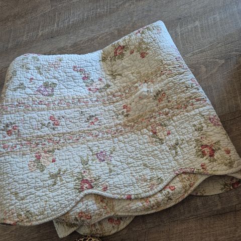 vat/sengetæppe, vintage vat/sengetæpper 189 x 120 x ca 4 cm i romantisk rosa farve med blomstermotiv. Bomuldsbetræk. Pris 400 kr