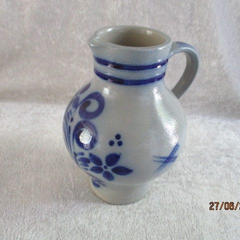 Hollandsk kande blå/grå, retro, saltglaseret. Pæn og velholdt uden skår. Højde 18,5 cm.