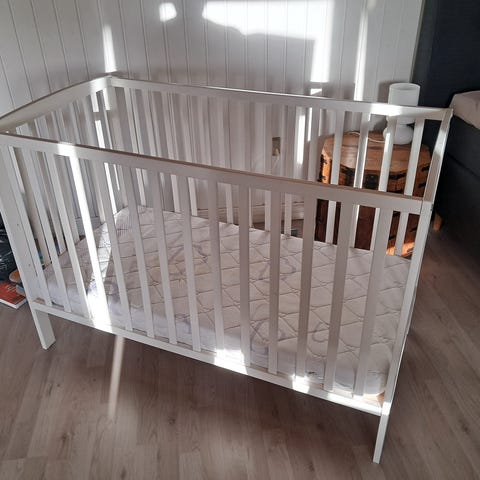 Tremmeseng, b: 65 l: 124, Aldrig brugt. Der følger madras og sengerand med.