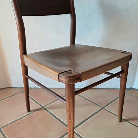 Teaktræ og sort læder. Stolen er i god stand, har en fin patina og sædet er nypolstret.
