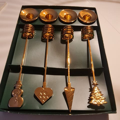 Advent lysholder, George Jensen advents lysholdere forgyldt, i ubrudt emballage. Flettet hjerte, kræmmerhus, juletræ og snemand. Udgået , produceret i Danmark. Kan ses på Frederiksberg.