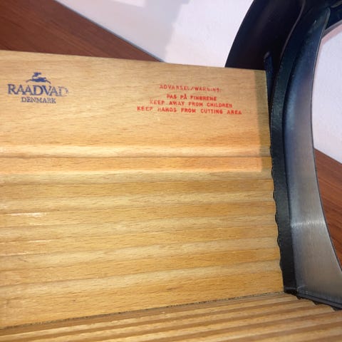 Rådvad skæremaskine i flot blå farve, klingen trænger til rensning men ellers er den i fin stand