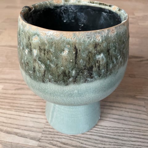 Urtepotteskjuler af keramiker. Tror der står HK. Den er 12 cm høj og øverst er diameteren 12 cm. Ingen skår