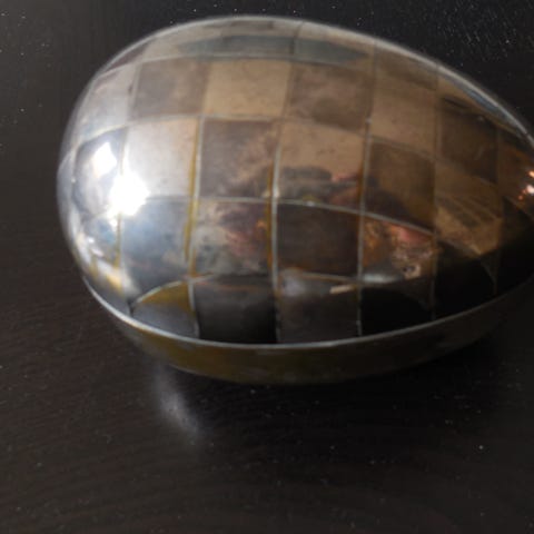 Opbevarings Æg, Frelsens chokolade, Smukke opbevarings æg i aluminium. Kan bruges til opbevaring af chokolade, slik eller andet nips. Hvis låget tages af kan bunden bruges som blomsterskjuler. 2 stk sælges samlet for 100 kr.