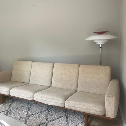 Vores familie er desværre blevet for stor til vores elskede wegner-sofa, og den leder derfor efter et nyt hjem. Jeg tror modellen hedder GE 236/4 men er ikke helt sikker. Sofaen har det originale dybblå betræk i uld. Betrækket har små slitager og enkelte huller, ikke noget der springer i øjnene, men den slidt (se billeder). Betrækket er i øvrigt aftageligt, og vi har vasket det på uldprogram en enkelt gang, hvilket fjernede alle de små pletter der var kommet i årenes løb. Nogle af syningerne er gået op ifm. vask (se billede).