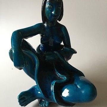 Royal Copenhagen Stentøjsfigur Pige med Hat med Grøn glasur No 20874. Designet af Helge Christoffersen i jan 1948. Nr. 1/10, No 20874. 2. Sortering. Måler 37 cm. Glasur med krakkeleringer.