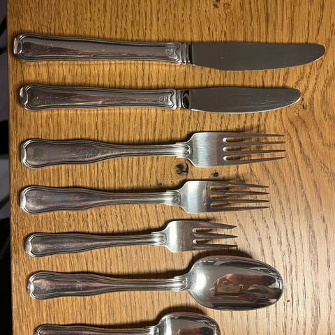 Georg Jensen Sterling Sølv Pinje Bestiksæt til 8 personer, 32 dele Sættet består af flg: 8 x Spisekniv med kort skaft, 24,7 cm 8 x Spisegafler, 18,7 cm 8 x Spiseskeer, 20 cm 8 x Theskeer, 13,6 cm Designet i 1940 af Gundolph Albertus (1887 - 1970) Gundolp Albertus arbejdede i Georg Jensens sølvsmedje i 40 år. Fra 1926 - 1954, var han assisterende direktør og overvågede virksomhedens produktion og kvalitetssikrede håndværket. Fra 1908 til 1911 studerede han sølvsmed i München og Paris. Da han kom til Danmark, arbejdede han ved Georg Jensen sølvsmedje og studerede også skulptur på Det Kongelige Danske Kunstakademi, hvorfra han dimitterede i 1915. Albertus blev Jensens svoger, da han blev gift med Jensens kone, Johanne’s søster. Udover at føre tilsyn, designede han også smykker, bestik og korpus. I 1930 designede han det populære bestikmønster Cactus og i 1940 Bittersweet, i 1941 Mitra, som var det første rustfri bestikmønster. Han designede kopper, skåle, fade, bakker og cocktailshakere. Meget af hans korpus fra 1930’erne har meget slanke, morderne former med blomsterudsmykning. Han modtog en guldmedalje på verdensudstillingen i Paris i 1925 og et diplome d’honneur ved den internationale udstilling i 1937 i Paris.