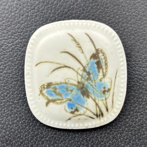 Royal Copenhagen brosche i porcelæn. Forside med Hjelm fra Hermes samt tekst: Danmark 1939. Måler 3,1cm