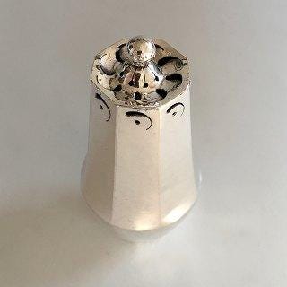Georg Jensen Sterling Sølv Drue Sukker Strøbøsse No 296. Fra 1933-1944. Vejer 264 gram. 18 cm Høj. Designet af Georg Jensen (1866-1935) Georg Jensen var en verdens berømt sølvsmed, der skabte sølvprodukter af kunstnerisk og håndværksmæssig højeste kvalitet. Hans virksomhed har igennem tiden haft over 90 designere. Jensen var meget kunstnerisk som barn og da han var 14, flyttede familien til København, så han kunne komme i lære hos en guldsmed. Hans ønske var dog at blive billedhugger, så han blev optaget som skulpturstuderende på Det Kongelige Kunstakademi i København, hvorfra han dimitterede i 1892 som 25-årig. I tiden efter, mødte han Johan Rohde, maler, designer, billedhugger, forfatter og arkitekt, der sammen med Joakim Skovgaard havde grundlagt Den Frie Udstilling, hvor Jensen blev tilbudt at udstille sin skulptur, som var blevet afvist på Charlottenborgudstillingen. Jensen fik et rejselegat af Det Danske Akademi. Han blev han inspireret af jugendstilen, hvor skønhed og nytte smeltede sammen. An besluttede selv at forene det smukke og praktiske. Jensen tog et job hos Mogens Ballin, dansk Art Nouveau kunstner. Ballin tillod kunstnerne, der arbejdede for ham, at udstille deres værker under egne navne og han gav Jensen kommission. 1904 besluttede Jensen sig for at åbne egen sølvforretning. Han beskæftigede sig med smykker, da det krævede en lille investering. Samme år udstillede han for første gang som selvstændig sølvsmed på Kunstindustrimuseet i København, hvilket var en succes, der kunne mærkes på værkstedet, hvor salget voksede støt. Hans succes med smykker, fik ham til at lave korpus. Han lavede en tekande med det velkendte blomstermotiv ”Magnolia”, hvilket blev prototypen for et hel te/kaffestel. 1916 blev selskabet GEORG JENSEN SØLVSMEDIE A/S stiftet Han vandt Grand Prix på verdensudstillingen i 1927, 1929, 1932 og 1935. Georg Jensen havde fem børn og afgik ved døden i 1935 som 69-årig.