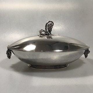 Unika Georg Jensen Sterling Sølv Lågdåse H 21.5 cm Diam 13.5 cm Vægt 999 gr (Se sidste billede for sammenligning) Designet af den svenske prins Sigvaard Bernadotte (1907 - 2002) Prins Sigvard Bernadotte drømte om at blive skuespiller, men hans fader (Gustav Adolf VI, kongen af Sverige) og hans farfar ville ikke acceptere dette, hvilket ledede ham til at læse kunsthistorie på Upssala Universitetet i Sverige. Hans engagement blev at designe smukke og stilfulde ting, der samtidig var praktiske, nytteværdige og brugbare. Som 23-årig begyndte han at designe for Georg Jensen Sølvsmedje. Han stil var elegant, fornem med præference for geometriske figurer, kugler, cylindre og tragte med indgraverede linjer samt lodrette parallelle linjer, hvilket ikke var moderne svensk stil, hvilket var en afvigelse fra den typiske danske Georg Jensen stil.