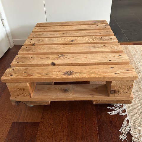 Sofabord lavet af 3 slebede, olierede og lakerede paller.