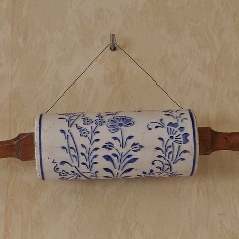 Kunsthåndværk dekoreret kagerulle m blomster, Gl håndmalet kagerulle blomstereng. Retro