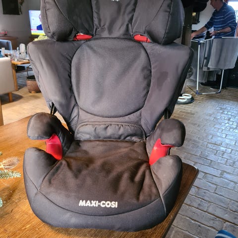 Stolene er brugte, men i fin stand. Betrækket er helt og kan tages af og vaskes. Perfekt som ekstra stol i bedsteforældrenes bil eller som en billig og sikker løsning, hvis man mangler en ekstra autostol.