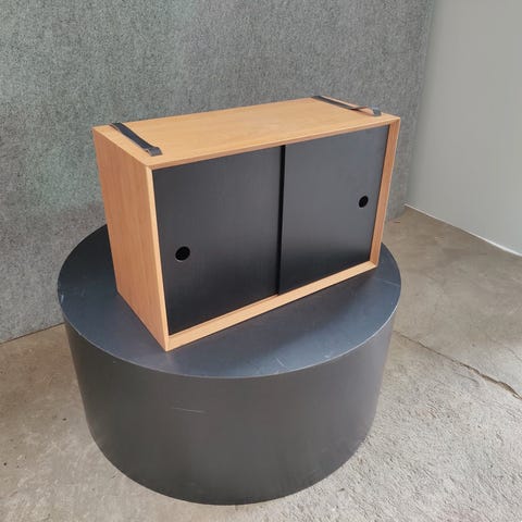 Helt unik arkitekttegnet reol. Aluminium/stålvanger som bære hylder. Kan sammensættes på flere måder. Mål angivet et som på foto. Kan stå af sig selv. Står helt stabil. Skydelåge og skuffer kører godt. God plads til service el. Lign. Ekstra hylde haves. En af hylder er ridset. Her placeret øverest, så det ikke ses i dagligdagen.