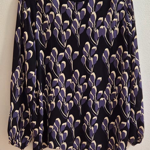 Skjorte, Langærmet bluse, Nue` Notes, str. 42, Bundfarve sort med roligt, lille lyst mænster , Viscose, Næsten som ny, Smuk, behagelig bluse med knaplukning , kun brugt få gange. Oprindelig pris ca 350 kr.