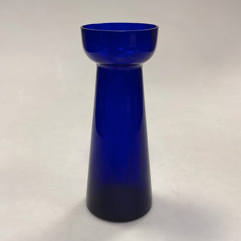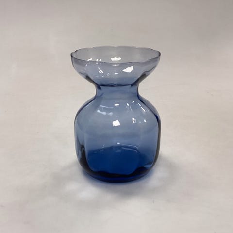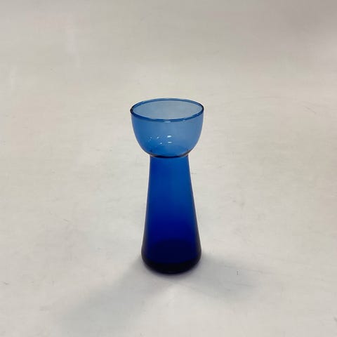 Lille Blå Blomsterløg Vase Holmegaard / Kastrup / Fyens Glasværk. Bølget optik indvendig øverst. Glat optik nederst. Egnet til perlehyacint, erantis, vintergæk, etc. Måler ca. 7,7 cm / 3,03 in.