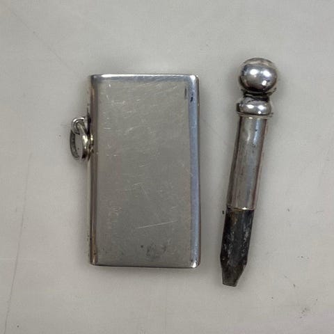 Baltiske udstilling Malmø notesbog i sølvplet Slidt, men i god stand, med fungerende pen, fra 1914 Kan hænges om halsen Måler 7,3 cm x 4,8 cm / 2.87 inch x 1.89 inch Denne vare kan afhentes i følgende butik: Lyngbyvej 155, 2100 Kbh. Ø