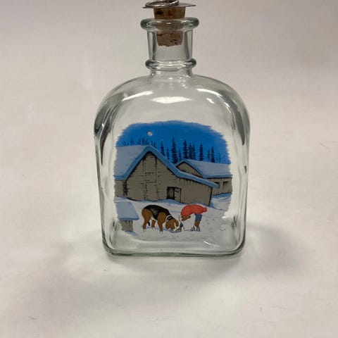 Holmegaard Harald Wiberg Nisse og Kat Snapseflaske med 2 glas. Designet i 1989 efter Harald Wibergs tegninger. Flasken måler 17 cm x 10,5 cm (6,69 in. x 4,13 in.) Glassene måler 6 cm (2,36 in.)