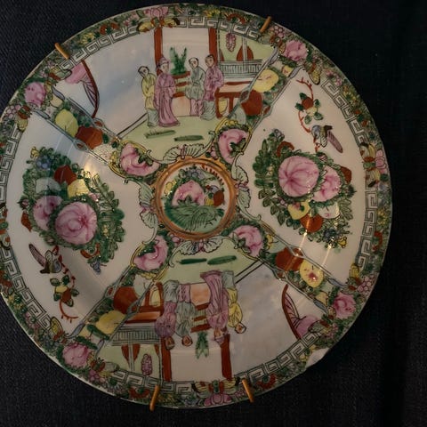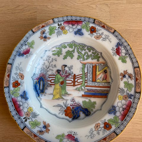 Porcelæn, Kinesisk platte/tallerken, Kinesisk blå og hvid malet ristallerken.