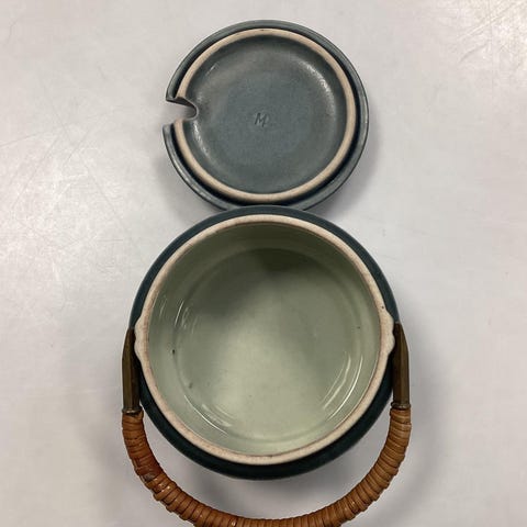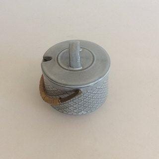 Bing og Grøndahl Kronjyden Brun Azur Marmeladekrukke med låg og basthank. Måler 10,5 cm x 7 cm.