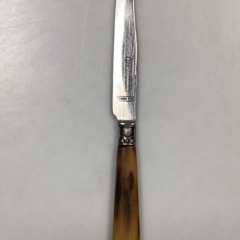 Raadvad Rustfri Frokostkniv med gulligt plasthåndtag/kunsthorn. I god stand. Måler 20,3 cm / 7,99 in.