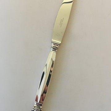 Georg Jensen Sterling Sølv 'Konge' Frokost Kniv, Langt Skaft og Grillskær No 024. 20.5 cm. Design Johan Rohde. Designet i 1915 af Johan Rohde (1856 - 1935). Johan Rohde var grafiker, maler, arkitekt, designer og kritiker. I 1880’erne, var Rohde en vigtig kunstner i Tyskland og Danmark. Han udfordrede de traditionelle måder at undervise på Det Kongelige Danske Kunstakademi og var førende i tilblivelsen af Den Frie Udstilling, som havde til formål at vise værker af kunstnere, hvis arbejde ikke blev accepteret. Han designede genstande til hverdagen - møbler, sølvtøj og korpus til hans eget hjem. Rohde og Georg Jensen mødte hinanden første gang, da Rohde bestilte Jensen til at udføre et af hans korpusdesigns. Da dette var vellykket, besluttede de at fortsætte samarbejdet. De arbejdede sammen i mange år efter.