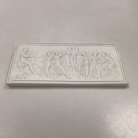 Bing og Grøndahl Bisquit Amor med en svane og drenge der plukker frugt (sommer). Kopi af relief modelleret i Rom i 1811. Måler 12 cm x 15 cm.