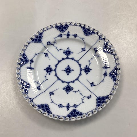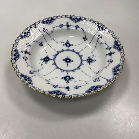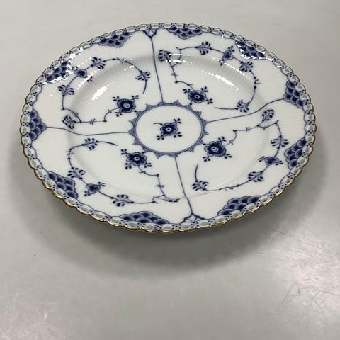 Royal Copenhagen Musselmalet Helblonde Flad Tallerken med guld No. 1084. Måler 25 cm / 9 27/32 inch. 1. sortering.