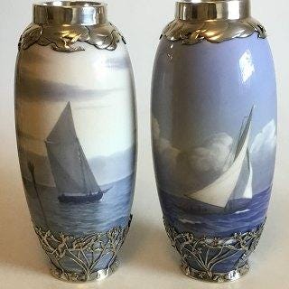 Par Royal Copenhagen Art Nouveau Vaser med Viking Skibe No 336 / 63 A Måler 17,5cm / 6.89 inch