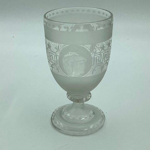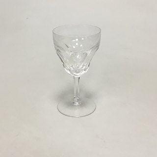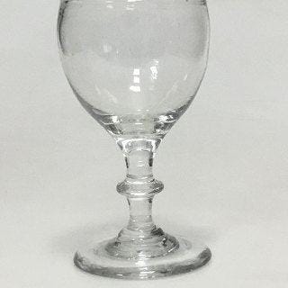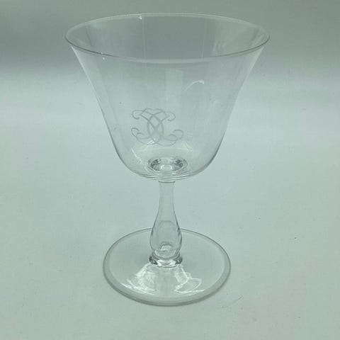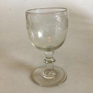 Vinglas med Klokkeformet cuppa og vinløv. Indgraveret MR. Måler 11,7 cm. Fra 1980-1900