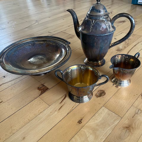 5 Dele Sølv Plet Kaffe og The sæt Måler: Kaffekande 20cm / 7.87 inch Thekande 15cm / 5.91 inch Denne vare kan afhentes i følgende butik: Store Kongensgade 76, Lyngbyvej 155, 2100 Kbh. Ø