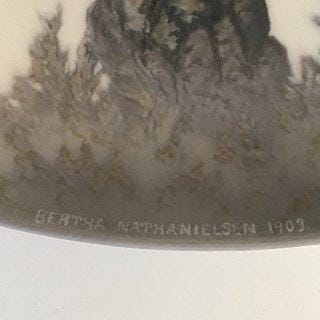 Tre Kgl. Porcelæn Ovale Vægtallerkener med typografisk motiver fra 1870-1880 af Emil Cordius Heinrich Orth. De måler 18cm og er i rimelig god stand. To af platterne har afslag bag på i siden. Samt der er div små afslag på sløjfen i toppen. Royal Copenhagen. Items are signed O... for Emil Cordius Heinrich Orth