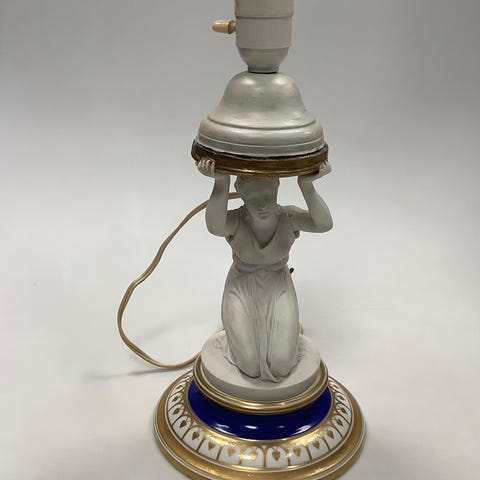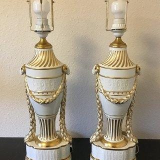Royal Copenhagen balusterformede lamper på sokkel dekoreret med guirlander, vædderhoveder. Med Juliane Marie mærke fra 1905-12. Monteret med ledning. Måler 65 cm incl. fatning. 2. Sortering, da der er støtte mærke på nederste del af guirlanderne.