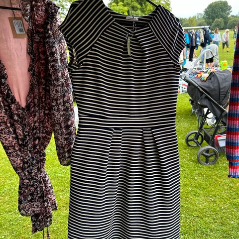 Flot kjole med lyseblå foer og bindebånd i løbegang. Brugt få gange. Fra ikke ryger hjem.