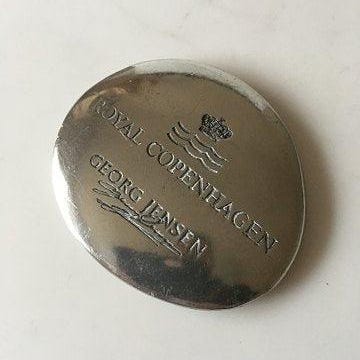 Georg Jensen Inc. New York Forsølvet Forhandler Plaquette Måler 11.5 cm x 12.3 cm (4.52 inch x 4.84 inch) Designet af Georg Jensen (1866-1935) Georg Jensen var en verdens berømt sølvsmed, der skabte sølvprodukter af kunstnerisk og håndværksmæssig højeste kvalitet. Hans virksomhed har igennem tiden haft over 90 designere. Jensen var meget kunstnerisk som barn og da han var 14, flyttede familien til København, så han kunne komme i lære hos en guldsmed. Hans ønske var dog at blive billedhugger, så han blev optaget som skulpturstuderende på Det Kongelige Kunstakademi i København, hvorfra han dimitterede i 1892 som 25-årig. I tiden efter, mødte han Johan Rohde, maler, designer, billedhugger, forfatter og arkitekt, der sammen med Joakim Skovgaard havde grundlagt Den Frie Udstilling, hvor Jensen blev tilbudt at udstille sin skulptur, som var blevet afvist på Charlottenborgudstillingen. Jensen fik et rejselegat af Det Danske Akademi. Han blev han inspireret af jugendstilen, hvor skønhed og nytte smeltede sammen. An besluttede selv at forene det smukke og praktiske. Jensen tog et job hos Mogens Ballin, dansk Art Nouveau kunstner. Ballin tillod kunstnerne, der arbejdede for ham, at udstille deres værker under egne navne og han gav Jensen kommission. 1904 besluttede Jensen sig for at åbne egen sølvforretning. Han beskæftigede sig med smykker, da det krævede en lille investering. Samme år udstillede han for første gang som selvstændig sølvsmed på Kunstindustrimuseet i København, hvilket var en succes, der kunne mærkes på værkstedet, hvor salget voksede støt. Hans succes med smykker, fik ham til at lave korpus. Han lavede en tekande med det velkendte blomstermotiv ”Magnolia”, hvilket blev prototypen for et hel te/kaffestel. 1916 blev selskabet GEORG JENSEN SØLVSMEDIE A/S stiftet Han vandt Grand Prix på verdensudstillingen i 1927, 1929, 1932 og 1935. Georg Jensen havde fem børn og afgik ved døden i 1935 som 69-årig.