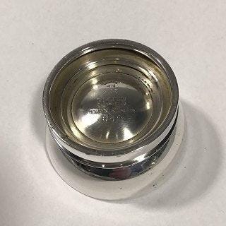 Georg Jensen Sterling Sølv Pyramide Saltkar No. 15 (Blå) Måler Dia 4.2 cm (1.65 inch) Vægt 23.7 gr /0.83 oz. Designet af Harald Nielsen (1892 - 1977) Harald Nielsen var lillebror til Georg Jensens tredje kone, Johanne. Han ville være maler, men blev trukket ind i Georg Jensens sølvsmedje, hvor han startede som lærling i 1909. Derfra arbejdede han sig op som designer/direktør for smedjelærlingeskolen. I 1954 blev han smedjedirektør og i 1958, blev han kunstnerisk leder, en stilling an besad indtil 1962. Nielsens rolle som lærlingeskoleleder var særlig vigtig efter Jensens død i 1935, da Nielsen sikrede den forsatte høje kvalitet af firmaets design og produktion, ved at rekruttere dygtige unge sølvsmedje og designere, samt uddanne dem efter Georg Jensen Sølvsmedjens høje standarter.