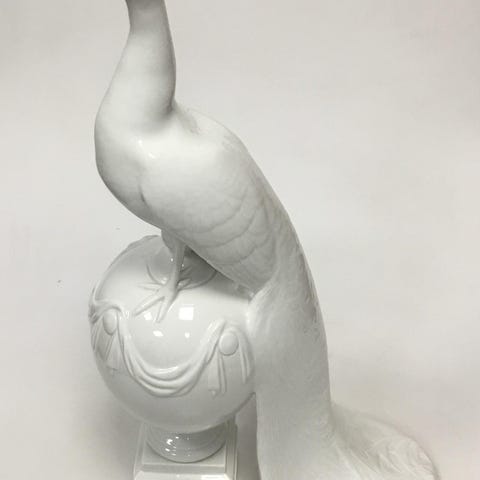 Royal Copenhagen figur af påfugl på kugle. Designet af Arnold Krog. Måler 55 cm(21 21/32 in.). 2. sortering og mangler hårpragt