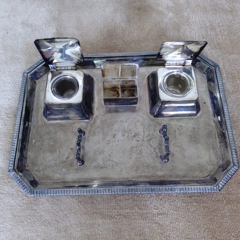 Skrivesæt med blæk- og sandhus. Tysk eller fransk oprindelse. Opretstående blad på venstre side knækket. Måler 15 x 14 x 6 cm (5 29/32 x 5 33/64 x 2 23/64 in).
