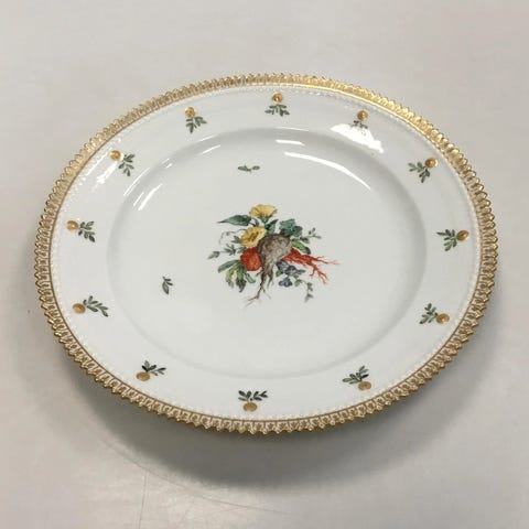 Royal Copenhagen Flora Danica Juliane Marie Frokosttallerken No 17/3550. Dekoreret med frugter/grøntsager i overglasur og guldkant. Måler 22 cm(8 21/32 in.)