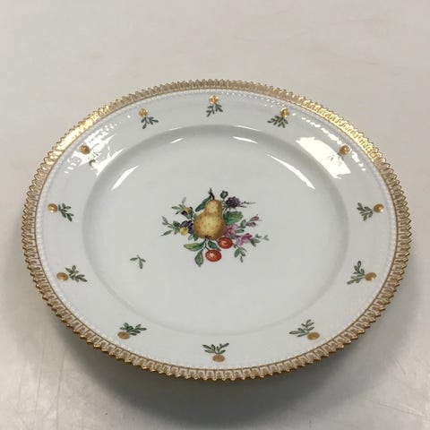 Royal Copenhagen Flora Danica Juliane Marie Middagstallerken No 17/3549. Dekoreret med frugter i overglasur og guldkant. Måler 25cm (9 27/32 in.) 2.Sortering med skår i guldkanten.