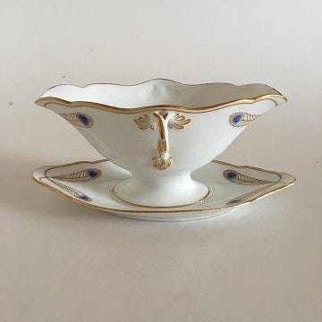 Royal Copenhagen Stel No 118 Suppeterrin med Låg på Underfad. Påfugl med Guldkant. Selve terrinet måler 26 x 20 cm. I god stand uden det store slid på guldet, men låget har en reparation (se billede). Antikt, Sjældent Spisestel fra Royal Copenhagen