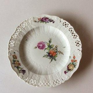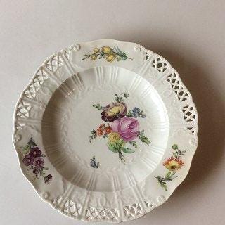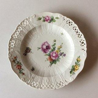 Royal Copenhagen Saksisk Blomst Middags-/Frugttallerken i luksusmodel med gennembrudt kant. Måler 25 cm. Da den kunstneriske leder, Arnold Krogh, omkring år 1900 ville øge kvaliteten af dekorationen af Saksisk Blomst og Flora Danica blev dette stel produceret med ekstra kraftige farver og af de allerbedste malere. Hver enkelt del er unikt signeret. Stellet blev solgt til en meget højere pris end de andre stel. Stellet blev produceret i perioden 1904 - 1908.