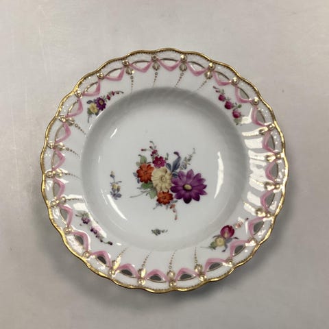 Antik Fuld Saksisk Blomst Frugt Tallerken med Gennembrudt Blondekant. I hel stand, med lidt guldslid. 23 cm dia. fra omkring 1800