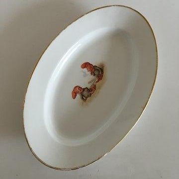 Oval Assiet med to Nisser der bærer på grøntsager. 23 x 15.5 cm. Guldet på kanten er slidt men stadig lidt synlig. Ellers er den intakt uden skår.